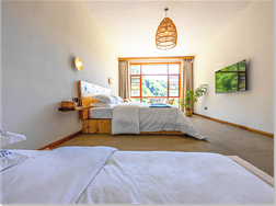 民宿設(shè)施齊全,服務(wù)功能完善,室內(nèi)裝飾到位,客房整潔寬敞,床上用品舒適柔軟,躺在床上可享受山村清晨第一縷陽光的沐;起床推窗盡情的呼吸清甜的空氣,眺望遠(yuǎn)出或隱或現(xiàn)的云霧纏繞在山巒之中,好一幅山村如畫的美景。